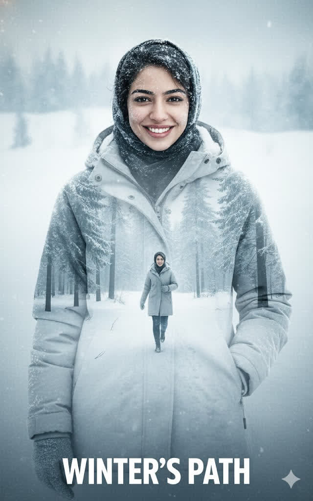 Ultra-realistic, high-resolution cinematic poster in the style of LEO. A woman (same uploaded image), standing in a cold snowy environment. He is wearing a light gray winter jacket with his sleeves slightly Brolled up, and one hand casually placed in his pocket while the other is partly visible. His face and hair have a frosty touch. The background is bright white with soft blue-gray shadows, giving a cold and peaceful tone. A double exposure effect merges his torso with a snowy forest pathway where a smaller version of her is seen running through the trees. cinematic, realistic, and atmospheric.