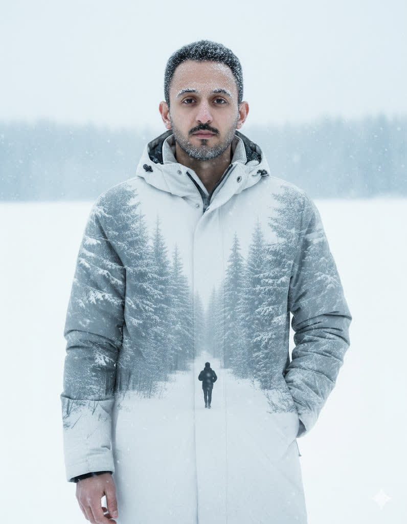 Ultra-realistic, high-resolution cinematic poster in the style of LEO. A man (exactly same uploaded image), standing in a cold snowy environment. He is wearing a light gray winter jacket with his sleeves slightly Brolled up, and one hand casually placed in his pocket while the other is partly visible. His face and hair have a frosty touch. The background is bright white with soft blue-gray shadows, giving a cold and peaceful tone. A double exposure effect merges his torso with a snowy forest pathway where a smaller version of him is seen running through the trees. cinematic, realistic, and atmospheric.