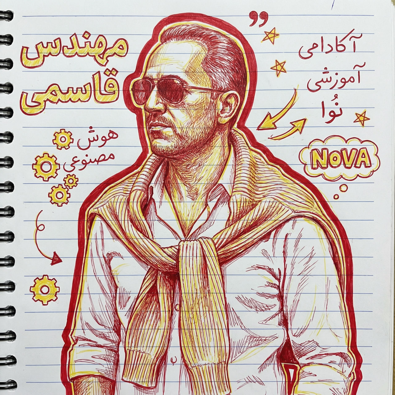 یک پرترهی ایلوستریشن دستکشیده از تصویر آپلودشدهی من، با خودکارهای قرمز و زرد روی کاغذ دفترچه تولید کن؛ الهامگرفته از هنر دودل و حاشیهنویسیهای کمیکی. شباهت کامل سوژه را حفظ کن، از خطوط بیانگر و حرکات خودجوش استفاده کن، هالهی برجستهی دورخط اضافه کن، این یادداشتهای دستنویس رو اطراف قرار بده [کلماتی رو که میخوای توی متن باشه بنویس با این فرمت ”…” ، “ …” ] و بافت واقعی strokes خودکار را حفظ کن.