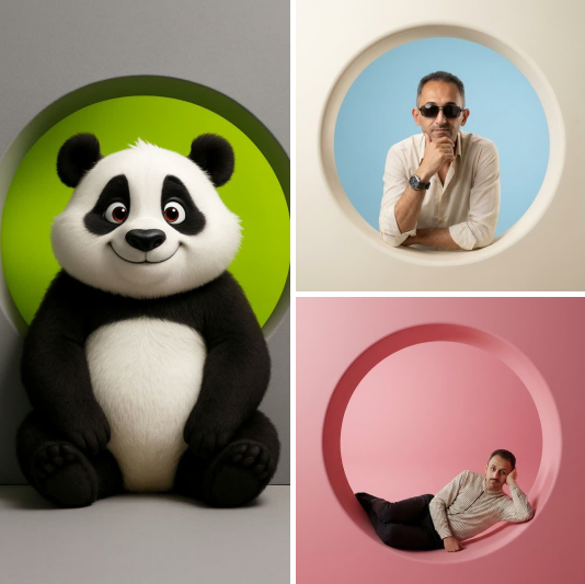 یک پرتره استودیویی سطح‌بالا از تصویر شخص اپلود شده که با یک حفره‌ی دایره‌ای بزرگ، قرارگرفته در مرکز یک دیوار ضخیم با رنگ مات [رنگ دیوار بیرونی] تعامل دارد.